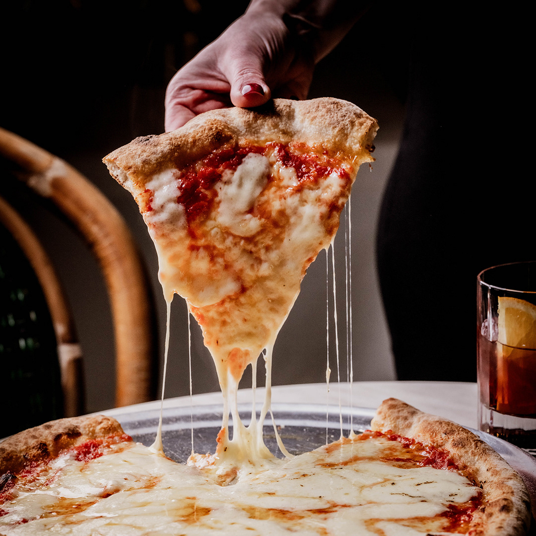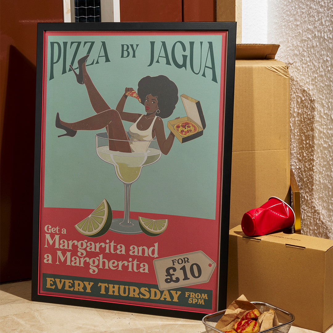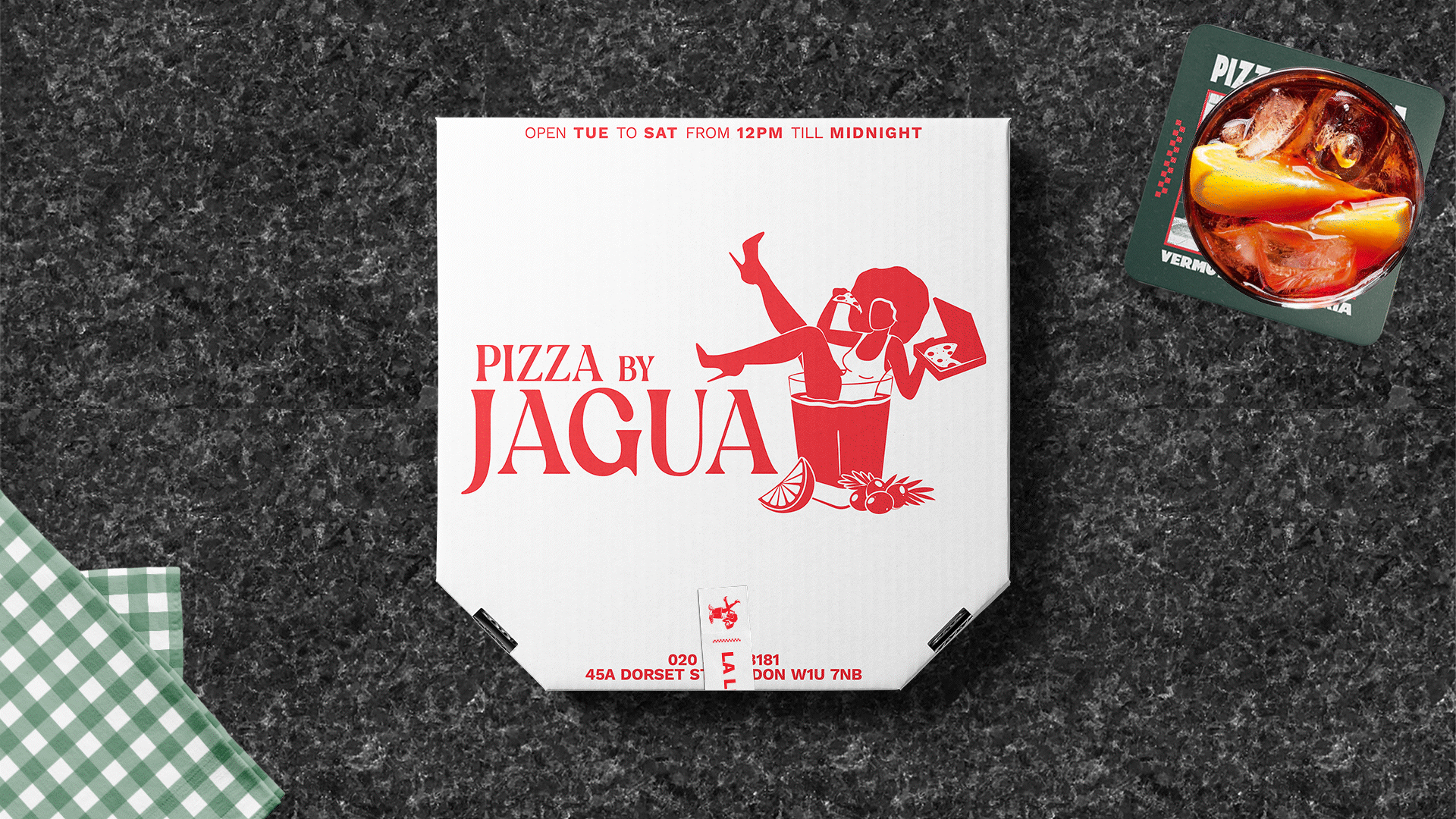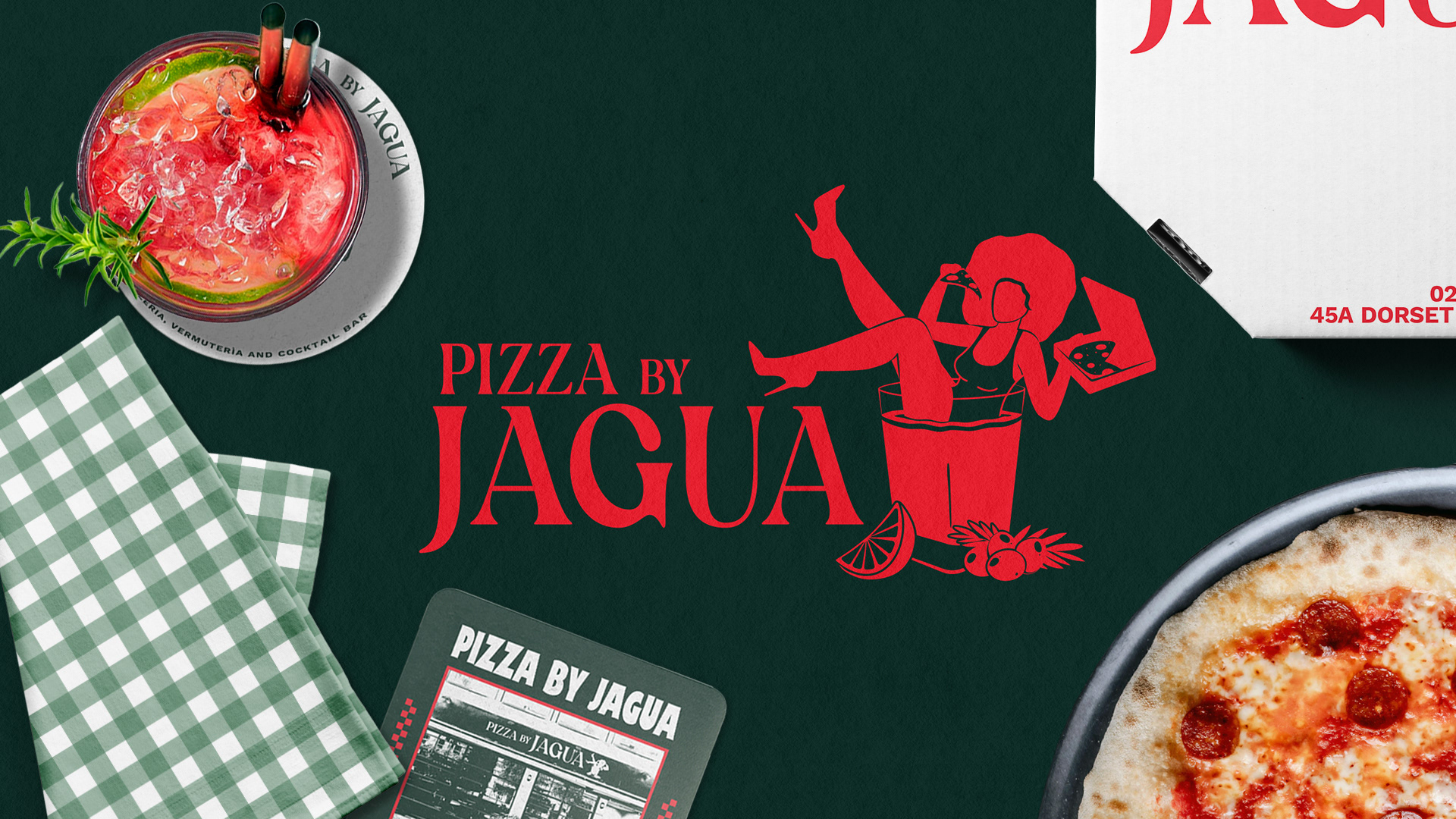 Rather than rely on overt cultural references or traditional design tropes, the concept embraces mood. Pizza By Jagua leans into a sense of intimacy and elegance, pairing old world charm with contemporary edge. This balance is captured in the brand’s signature icon: a woman lounging in a cocktail glass while eating pizza. Playful yet refined, she reflects the spirit of the restaurant, unapologetically bold, effortlessly relaxed, and always ready for a good time.